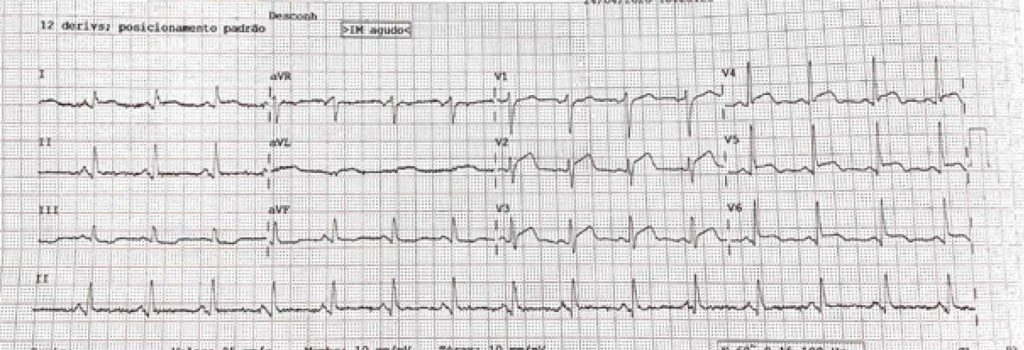 Paciente masculino, 39 anos, sem comorbidades prévias, deu entrada no serviço de urgência com queixa de dor torácica de forte intensidade, associada a náuseas, sudorese e leve desconforto respiratório. A dor era de característica opressiva e irradiava para ambos os ombros. Relatava que há 2 dias iniciou quadro de astenia, inapetência e febre (38,9 ºC), evoluindo com lesões de pele eritematosas polimórficas no dorso, há 1 dia da admissão.