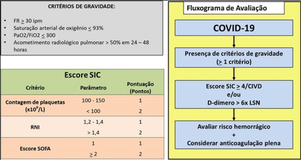 – Sugestão de manejo e fluxograma para avaliação de terapia anticoagulante em pacientes graves com COVID-19.FR: frequência respiratória; SIC: coagulopatia induzida pela sepse; RNI: razão de normatização internacional; SOFA: sequential organ failure assessment; CIVD: coagulação intravascular disseminada; LSN: limite superior da normalidade.
