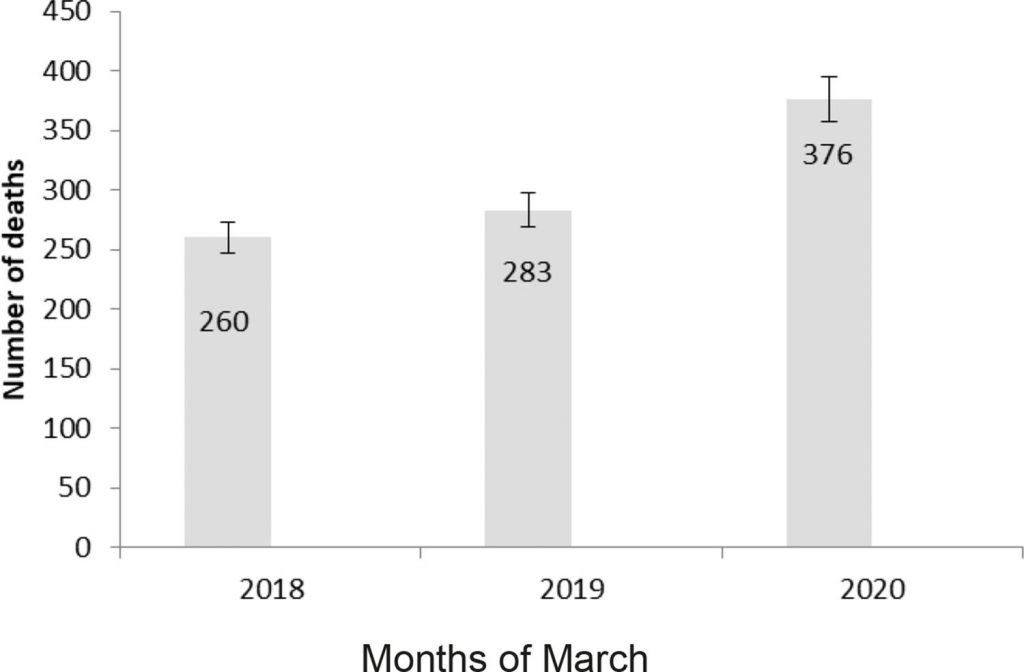 Assess the number of home deaths by cardiopulmonary arrest notified by the Mobile Emergency Medical Service (SAMU) in March 2018, 2019 and 2020.