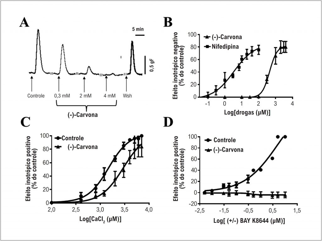 A (-)-carvona reduz a entrada de Ca+2 através de canais de Ca+2 do tipo L e, assim, diminui a contratilidade cardíaca e o Ca+2 intracelular e apresenta promissora atividade antiarrítmica no coração de ratos.