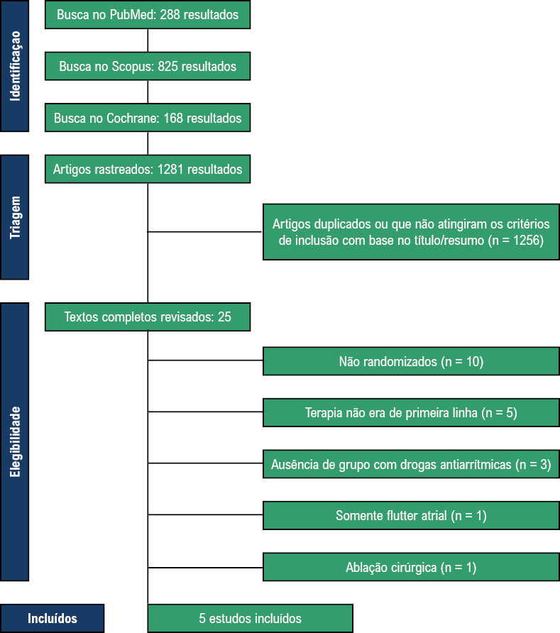 Buscamos, nos bancos de dados do PubMed, EMBASE, e Cochrane, ensaios randomizados controlados que compararam ablação por cateter com DAA para controle do ritmo cardíaco em pacientes com FA sintomática e descreveram os seguintes desfechos: (1) recorrência de taquiarritmia atrial (TA); (2) FA sintomática; (3) internações hospitalares; e (4) bradicardia sintomática. A heterogeneidade foi avaliada por estatística I2. Valores de p menores que 0,05 foram considerados estatisticamente significativos.