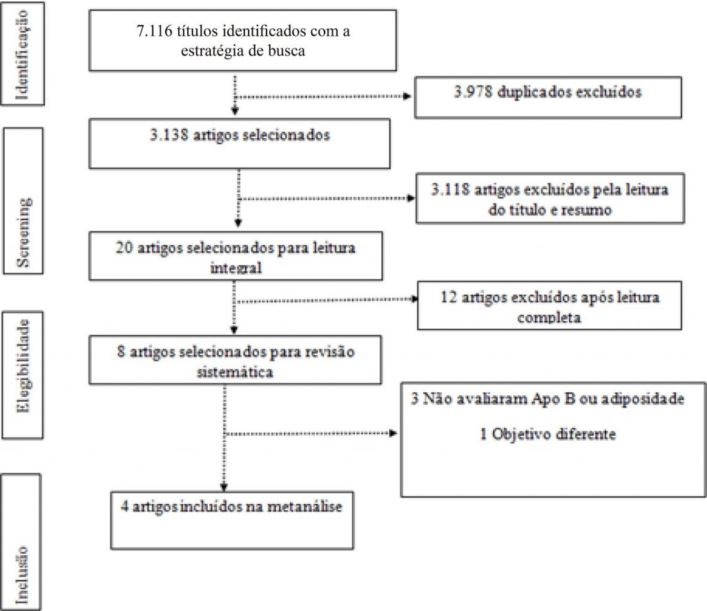8 artigos preencheram os critérios de elegibilidade, incluindo indivíduos com média de idade variando de 9 a 15,7 anos. Para a metanálise, incluíram-se 4 artigos, com total de 7.974 crianças e adolescentes. Observou-se aumento médio de 4,94 mg/dL (IC 95%: 4,22 a 5,67 mg/dL) nos níveis de ApoB naqueles com excesso de adiposidade. Para a ApoA1, identificou-se redução média de -8,13 mg/dL (IC 95%: – 9,09 a -7,17 mg/dL) nos níveis séricos desse marcador em indivíduos com maior adiposidade corporal. Além disso, a influência do excesso de adiposidade corporal sobre os níveis de ApoA1 e ApoB foi maior entre adolescentes do que entre crianças.