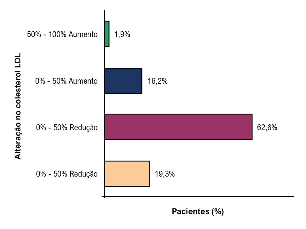 Dos 7.066 pacientes internados por IAM, 1.451 foram acompanhados em ambiente ambulatorial e tiveram pelo menos uma avaliação de colesterol LDL. A média de idade foi 60,8±11,4 anos e 35,8%, 35,2%, 21,5% e 7,4% dos pacientes apresentavam níveis de colesterol LDL≥100, 70–99, 50–69 e <50 mg/dL, respectivamente. Destes, 377 pacientes também tiveram pelo menos uma avaliação de colesterol LDL antes do IAM. As concentrações médias de colesterol LDL foram 128,0 e 92,2 mg/dL antes e após o IAM, com redução média de 24,3% (35,7 mg/dL). Os níveis de colesterol LDL foram reduzidos em mais de 50% em apenas 18,3% dos casos.
