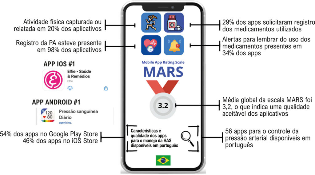 Cinquenta e seis apps preencheram os critérios para extração dos dados. A ferramenta mais prevalente foi o registro dos valores da PA (98%). A ferramenta para adesão aos medicamentos e lembretes para seu uso esteve presente em somente 29% e 34% dos apps, respectivamente. A média do escore MARS foi 3,4 ± 0,74 e 3,1 ± 0,61 para os apps do sistema Android e do sistema iOS, respectivamente. O item mais bem avaliado foi “funcionalidade” tanto para os apps Android como iOS.