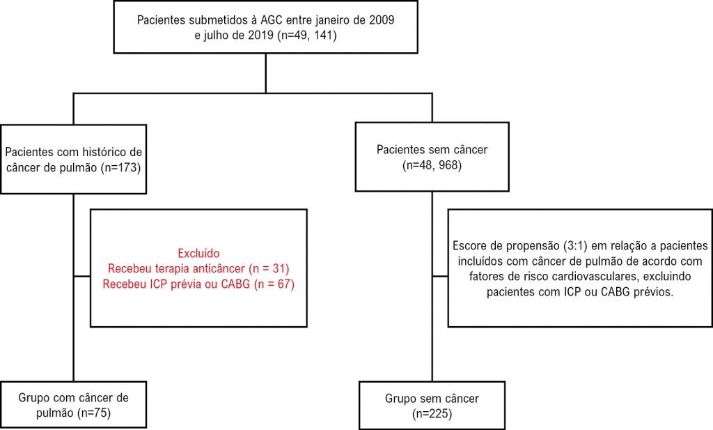 Trezentos pacientes, incluindo 75 recém-diagnosticados com câncer de pulmão e 225 pacientes correspondentes sem câncer, foram submetidos à angiografia coronária durante a internação, sem intervenção coronária percutânea (ICP) prévia nem enxerto de bypass da artéria coronária (CABG). O escore SYNTAX foi utilizado para avaliar a gravidade da DAC. Uma pontuação alta no escore foi definida como > 15 (o maior quartil do escore SYNTAX). O teste de tendência de Cochran-Armitage foi utilizado para verificar a distribuição dos escores dos pacientes. Uma análise de regressão logística foi utilizada para avaliar a associação entre a gravidade da DAC e o câncer de pulmão. Os valores de p foram estabelecidos quando o nível de significância era 5%.