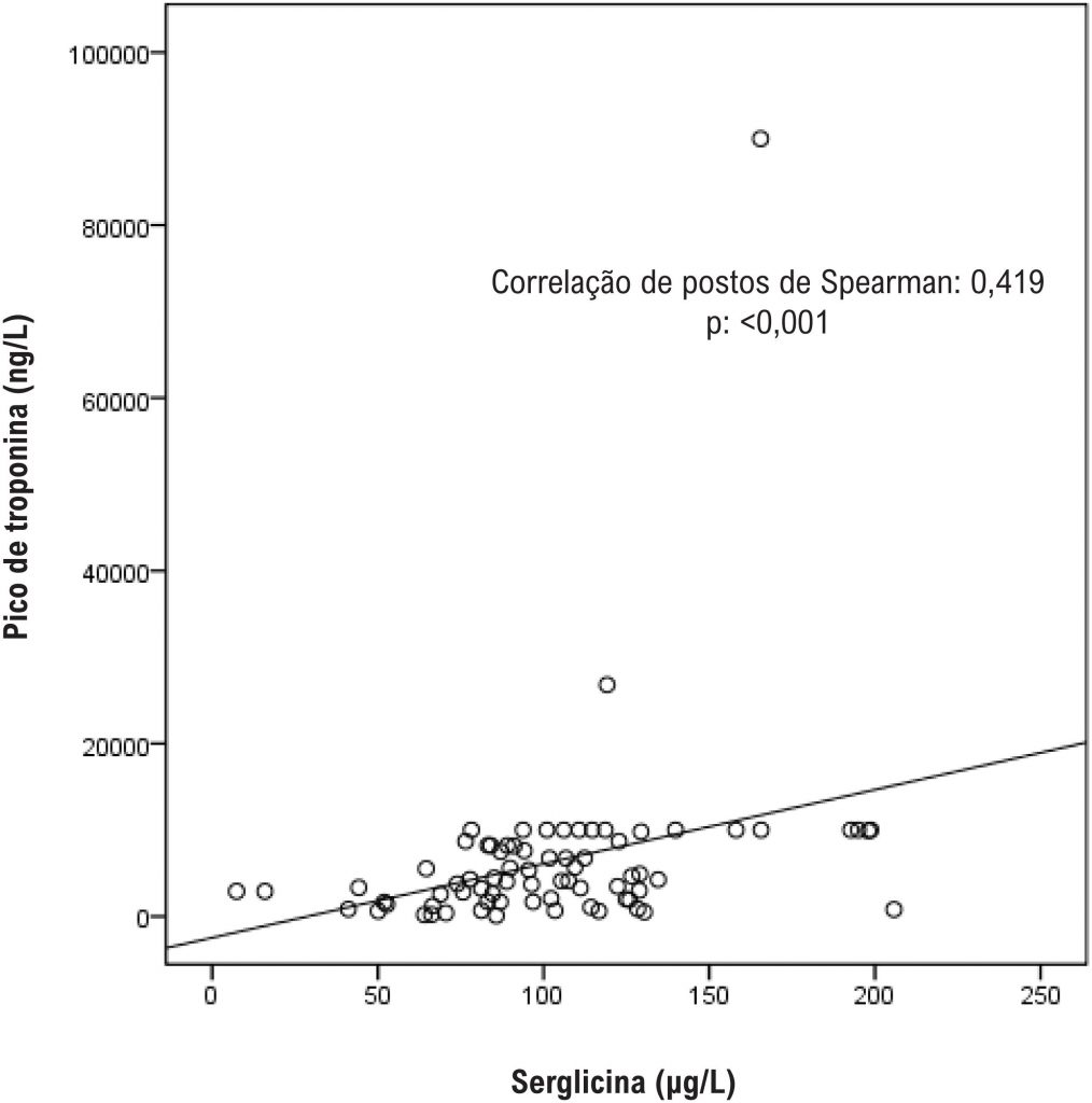 O grupo controle consistiu em indivíduos mais jovens e que fumam menos do que os do grupo IAMCSST. O número de mulheres no grupo controle foi maior do que no grupo IAMCSST. Os níveis séricos de serglicina foram significativamente maiores no grupo IAMCSST do que no grupo controle (102,81±39,42 vs. 57,13±32,25, p<0,001). As análises de correlação revelaram uma correlação positiva significativa entre a serglicina e a troponina (correlação de postos de Spearman: 0,419; p<0,001) e entre a serglicina e a proteína C-reativa ultrassensível (correlação de postos de Spearman: 0,336; p<0,001). A análise de regressão logística multivariada demonstrou que os níveis séricos de serglicina apresentaram-se independentemente associados com IAMCSST. Usando um nível de corte de 80,47 μg/L, o nível de serglicina foi preditor da presença de IAMCSST com uma sensibilidade de 75,7% e especificidade de 68,4%.