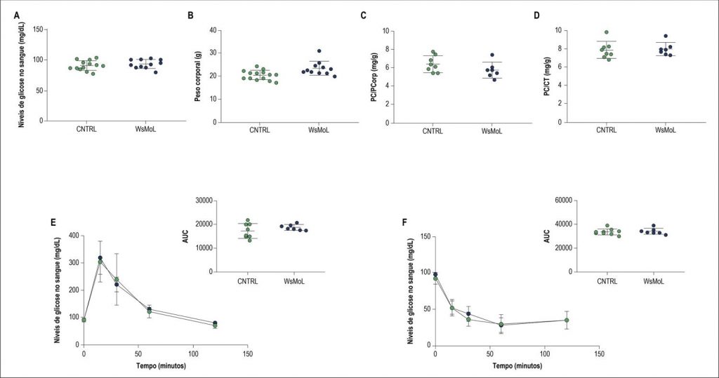O tratamento com WSMoL não induziu alterações nos níveis de glicose no sangue ou peso corporal em comparação com o grupo controle. Adicionalmente, as relações peso cardíaco/peso corporal e peso cardíaco/comprimento tibial estavam semelhantes em ambos os grupos. A ingestão de lectina também não modificou a tolerância à glicose ou resistência à insulina. Não foram observadas alterações nos parâmetros eletrocardiográficos ou na duração do potencial de ação cardíaco. Os corações dos camundongos dos grupos controle e WSMoL mostraram função ventricular esquerda preservada. Além disso, a WSMoL não induziu alterações na função mitocondrial (em todos os casos, p > 0,05).