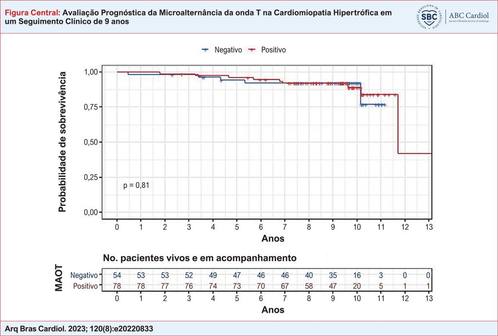 Um total de 132 pacientes (idade média de 39,5±12,6 anos) foram incluídos, com tempo de seguimento médio de 9,5 anos. A MAOT foi alterada em 74 (56%) participantes e normal em 58 (44%). Durante o seguimento, nove (6,8%) desfechos ocorreram, com prevalência de 1,0%/ano, sendo seis casos de MSC, dois choques apropriados do CDI e um episódio de TVS. MAOT alterada foi associada à taquicardia ventricular não sustentada no Holter (p=0,016), espessura septal≥30 mm (p<0,001) e resposta inadequada da pressão arterial ao esforço (p=0,046). Cinco pacientes (7%) e quatro pacientes (7%) com MAOT alterada e normal, respectivamente, apresentaram desfecho primário [OR=0,85(IC95%: 0,21–3,35, p=0,83)]. Curvas de eventos de Kaplan-Meir não apresentaram diferenças entre MAOT normal e alterada.