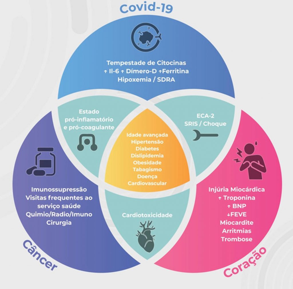 – Interseção entre o câncer, o coração e a COVID-19. A hipertensão, idade avançada, diabetes, obesidade e tabagismo são fatores de risco comuns às três doenças. O manejo no câncer na COVID-19 visa evitar visitas desnecessárias aos serviços de saúde, uma vez que estes pacientes sob tratamento oncológico são imunossuprimidos e mais suscetíveis ao desenvolvimento de complicações da COVID-19. As formas graves da COVID-19, manifestadas por hipoxemia e síndrome do desconforto respiratório agudo, decorrem de processo inflamatório sistêmico, com elevações de citocinas inflamatórias e fatores pró-trombóticos. As complicações cardiovasculares são frequentes nessa população, como trombose, arritmias, miocardite e disfunção ventricular. ECA2: enzima conversora de angiotensina 2; FEVE: fração de ejeção do ventrículo esquerdo; IL-6: interleucina-6; SDRA: síndrome do desconforto respiratório agudo; SRIS: síndrome da resposta inflamatória sistêmica. Quimio: quimioterapia; Radio: Radioterapia; Imuno: imunoterapia.