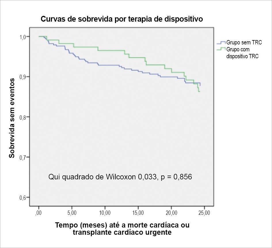 Um total de 450 pacientes com IC, dos quais 114 possuíam aparelho de TRC. Esses pacientes apresentaram um perfil de risco basal mais alto, mas não houve diferença em relação ao desfecho primário (13,2% vs 11,6%, p = 0,660). A pressão expiratória de dióxido de carbono no limiar anaeróbico (PETCO2AT) teve o maior valor de AUC, que foi significativamente maior do que o de pVO2 no grupo TRC (0,951 vs 0,778, p = 0,046). O valor de corte de pVO2 atualmente recomendado forneceu uma estratificação de risco precisa nesse cenário (p <0,001), e o valor de corte sugerido de 10 ml/min/kg não melhorou a discriminação de risco em pacientes com dispositivos (p = 0,772).