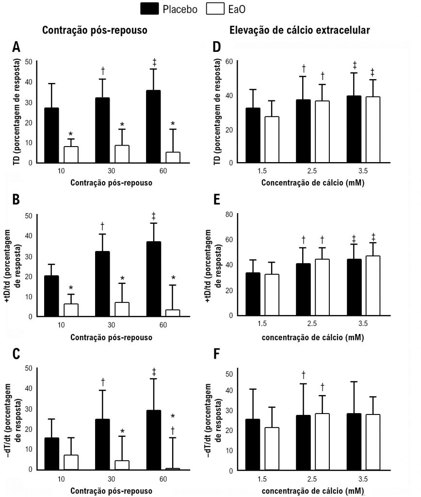 Ratos Wistar de 21 dias de idade foram distribuídos em dois grupos: controle (placebo; n=28) e estenose aórtica (EaO; n=18). A função cardíaca foi analisada com o ecocardiograma, músculo papilar isolado e cardiomiócitos isolados. No ensaio do músculo papilar, SERCA2a e a atividade do canal de Ca2+ do tipo L foram avaliados. O ensaio de cardiomiócitos isolados avaliou o trânsito de cálcio. A expressão proteica da proteínas do trânsito de cálcio foi analisada com o western blot. Os resultados foram estatisticamente significativos quando p <0,05.