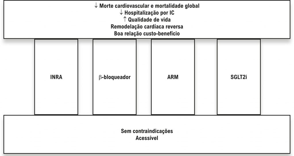 A insuficiência cardíaca (IC) com fração de ejeção reduzida (ICFER) leva à mortalidade, piora da qualidade de vida, e tem um impacto grande no sistema de saúde. Apesar de ensaios mostrarem a superioridade dos benefícios do inibidor da neprilisina e do receptor da angiotensina (INRA) em relação aos inibidores de enzima conversora da angiotensina (IECA), e a superioridade dos inibidores do cotransportador sódio-glicose 2 (SGLT2i) em relação ao placebo, as diretrizes atuais ainda recomendam o uso de IECA, antagonistas de receptor mineralocorticoide (ARM), e betabloqueadores como primeira linha de terapia da ICFER.– Nesta carta, serão discutidos os possíveis benefícios e riscos de se adotar INRA e SGLT2i como primeira linha de terapia da ICFER.