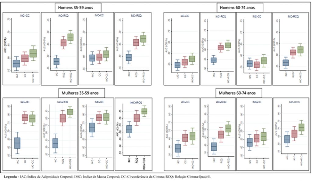 Indicadores combinados tiveram melhor capacidade preditiva do que um indicador isoladamente, sendo IAC+RCQ e IMC+RCQ melhores estimadores de risco coronariano em homens e mulheres, respectivamente. RCQ teve melhor desempenho individual.