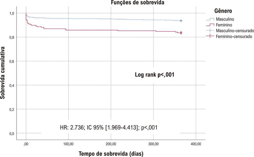As mulheres eram mais velhas que os homens (69,1±14,6 vs. 58,5±12,7 anos; p<0,001) com maior prevalência de idade acima de 75 anos (36,7% vs. 11,7%; p<0,001), diabetes (30,6% vs. 18,5%; p=0,001), hipertensão (60,5% vs. 45,9%; p=0,001), doença renal crônica (3,4% vs. 0,6%; p= 0,010) e acidente vascular cerebral isquêmico agudo (6,8% vs. 3,0%; p=0,021). Na apresentação, as mulheres apresentavam mais sintomas atípicos, menos dor torácica (p=0,014) e estavam mais frequentemente em choque cardiogênico (p=0,011)). As mulheres tinham mais tempo até a reperfusão (p=0,001) e eram menos propensas a receber terapia médica ideal (p<0,05). A mortalidade intra-hospitalar (p=0,001), em 30 dias (p<0,001), 6 meses (p<0,001) e 1 ano (16,4% vs. p<0,001) foi maior nas mulheres. A análise multivariada identificou idade acima de 75 anos (HR=4,25; IC 95%[1,67-10,77];p=0,002), classe Killip II (HR=8,80; IC 95%[2,72-28,41];p<0,001), III (HR=5,88; IC95% [0,99-34,80]; p=0,051) e IV (HR=9,60; IC 95%[1,86-48,59];p=0,007), Lesão Renal Aguda (HR=2,47; IC 95% [1,00-6,13];p=0,051) e dias de hospitalização (HR=1,04; IC 95%[1,01-1,08];p=0,030), mas não o sexo feminino (HR=0,83; IC95% [0,33-2,10];p=0,690) como fatores prognósticos independentes de mortalidade.
