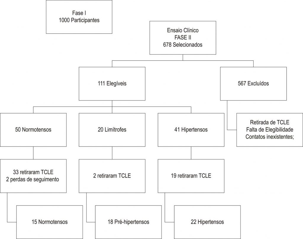Ensaio clínico, simples cego com 13 semanas de seguimento. Foram avaliados normotensos (≤130/85 mmHg), pré-hipertensos (≥130 e <139/≥85 e <90 mmHg) e hipertensos estágio 1 (≥140 e <160/≥90 e <100 mmHg). Utilizou-se medida casual e monitorização residencial da PA com aparelho automático OMRON 705CP, medida central da PA com Sphygmocor®, dosagem do sódio urinário de 24h (colhido no intervalo entre cada visita) e mensuração de sal de adição. Foi adotado nível de significância p<0,05 para todas as análises.