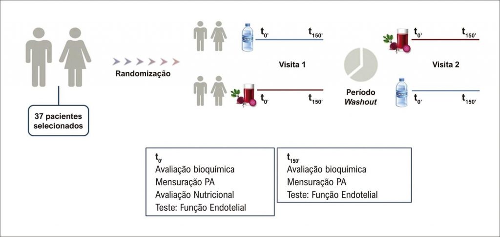 Este estudo avaliou os efeitos agudos de 500 mL de suco de beterraba rico em nitrato (SB; contendo 11,5mmol NO3–) na pressão arterial e na função endotelial em pacientes hipertensos tratados.