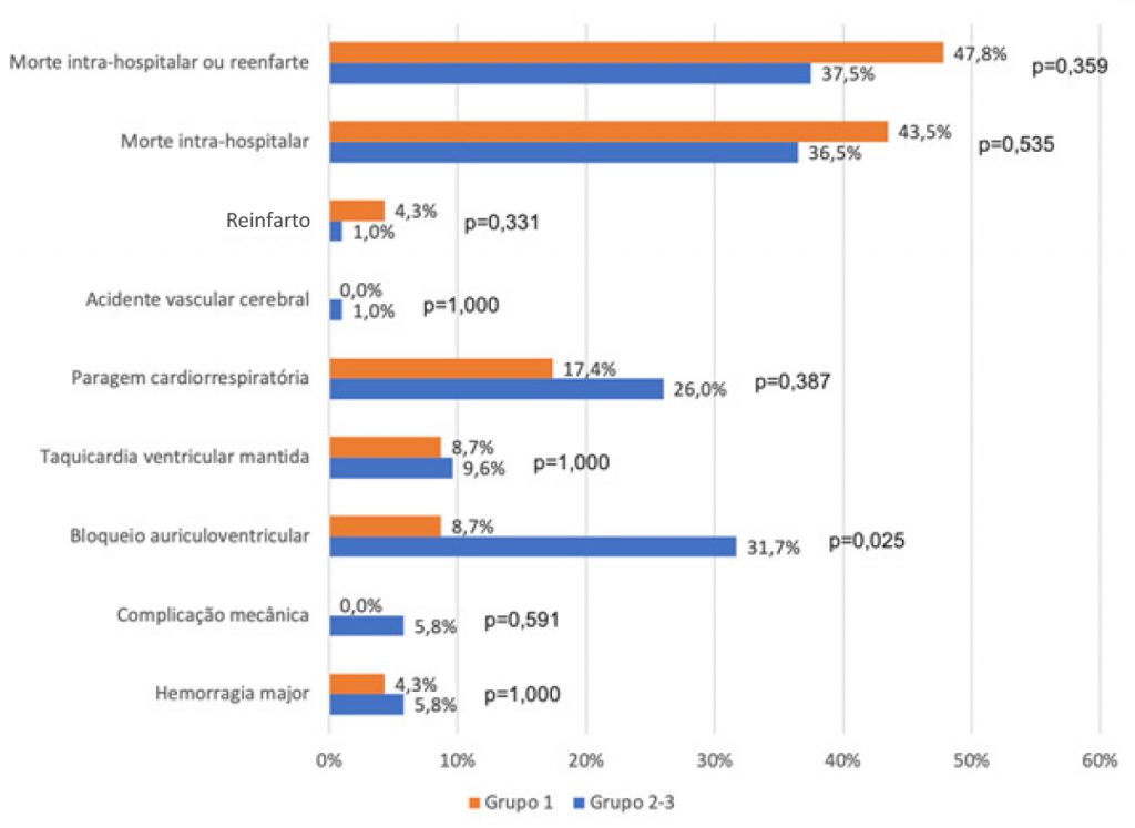 Identificaram-se 127 doentes com IAM, CC e DMV (18,1% no grupo 1 e 81,9% no grupo 2-3), com idade média de 70 ± 12 anos e 92,9% com IAM com supradesnivelamento do segmento ST. O endpoint primário ocorreu em 47,8% dos doentes do grupo 1 e em 37,5% do grupo 2-3 (p = 0,359). As taxas de mortalidade intra-hospitalar, reinfarto, acidente vascular cerebral e hemorragia major foram também semelhantes nos dois grupos. Os preditores de mortalidade intra-hospitalar nesta amostra foram a presença na admissão de disfunção ventricular esquerda (OR 16,8), bloqueio completo de ramo direito (OR 7,6) e anemia (OR 5,2), (p ≤ 0,02).