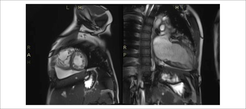Menina de seis anos com cardiomiopatia restritiva e hipertrabeculação na qual, devido ao início precoce da doença, foi realizado sequenciamento completo do exoma, revelando a presença de uma nova variante heterozigótica missense no gene FLNC. A mesma variante genética também foi identificada em seu pai, que, já adulto, apresentava resultados de imagem normais e não apresentava sintomas. Esta variante não foi relatada em bancos de dados populacionais ou na literatura médica atual e é classificada como provavelmente patogênica.