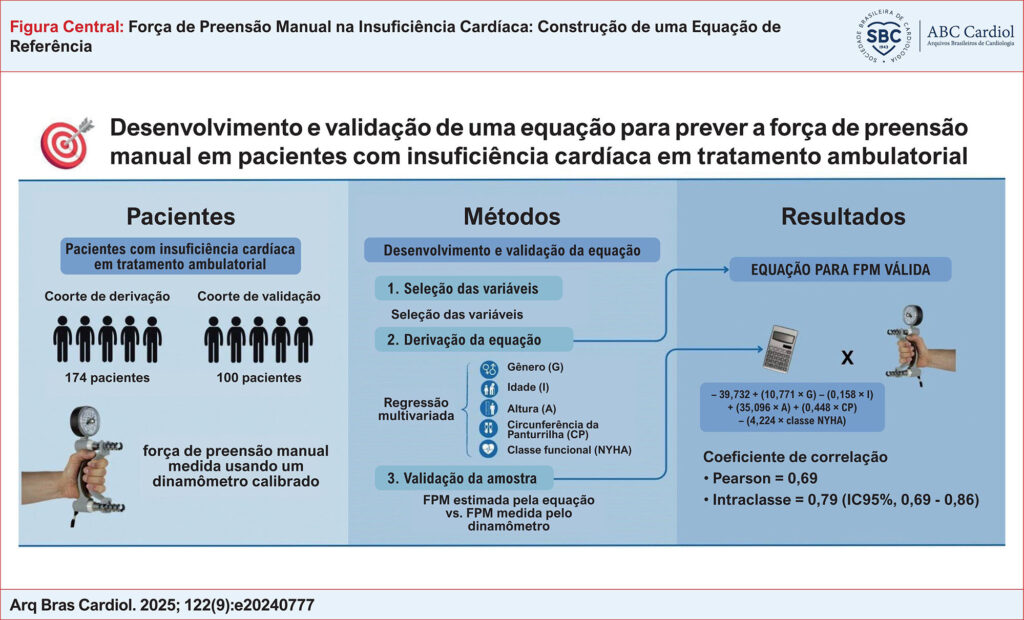 A força de preensão manual (FPM) é um indicador fundamental da força muscular global e da capacidade funcional em pacientes com insuficiência cardíaca (IC). No entanto, ainda não foram publicadas equações de referência específicas para essa população.
