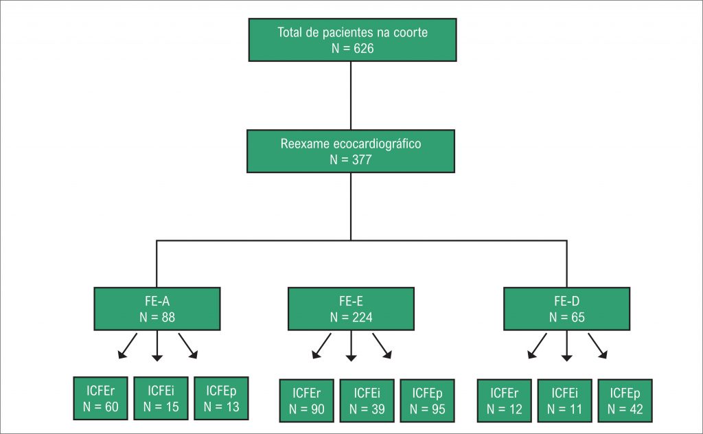 Dos 377 pacientes com IC grave, 23,3% apresentaram FE-A, 59,5% apresentaram FE-E e 17,2% apresentaram FE-D. Os resultados mostraram ainda 68,2% de insuficiência cardíaca com fração de ejeção reduzida (ICFEr) no grupo FE-A e 64,6% de insuficiência cardíaca com fração de ejeção preservada (ICFEp) no grupo FE-D. Os preditores de FE-A identificados foram faixa etária mais jovem, ausência de diabetes e fração de ejeção do ventrículo esquerdo (FEVE) menor. Já os preditores de FE-D encontrados foram ausência de fibrilação atrial, baixos níveis de ácido úrico e maior FEVE. Em um seguimento mediano de 40 meses, 44,8% dos pacientes foram vítimas de morte por todas as causas.