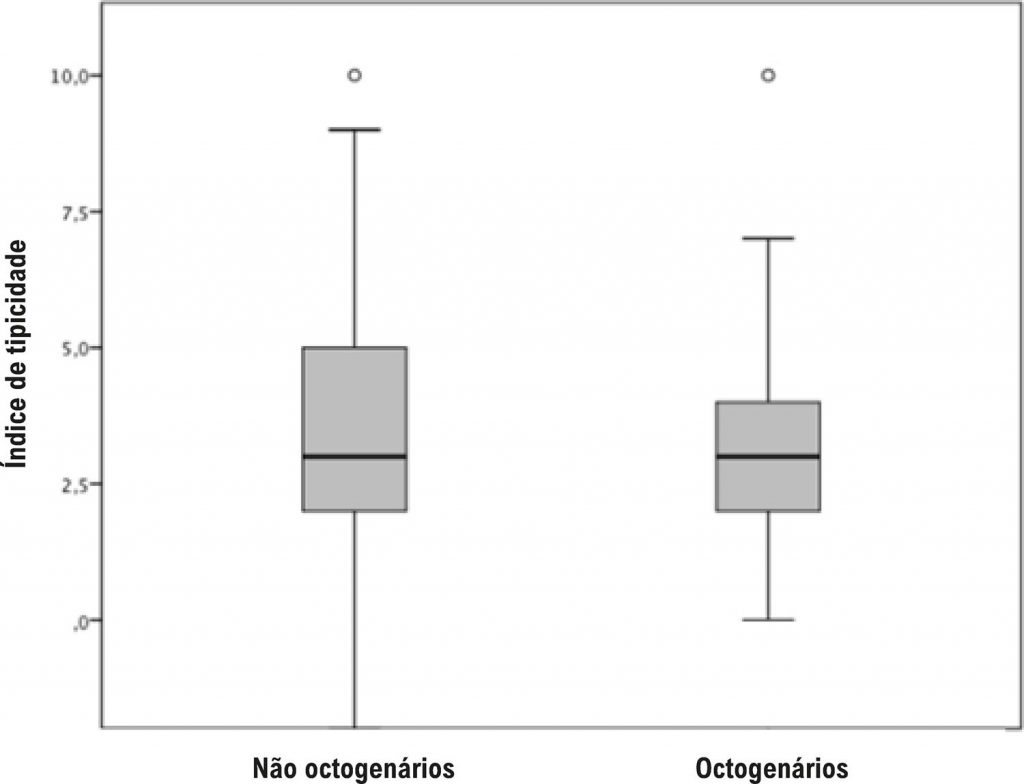 O Registro de dor torácica inclui pacientes internados com dor torácica aguda. Primeiramente, foi construído o índice de tipicidade dessa manifestação clínica: a soma de 12 características de sintomas (8 sintomas típicos e 4 sintomas atípicos). No subgrupo de pacientes com etiologia coronariana, o índice de tipicidade foi comparado entre octogenários e não octogenários. A significância estatística foi definida por p<0,05.