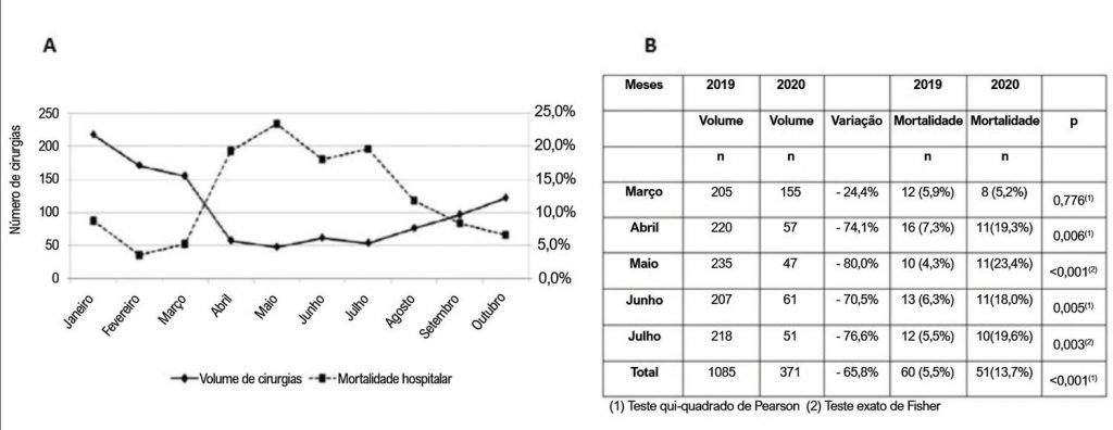 Painel A: Impacto da primeira onda do período pandêmico com redução do volume de cirurgia cardiovascular e aumento da mortalidade hospitalar pós-operatória em 2020. Painel B: Volume de cirurgia cardiovascular e mortalidade hospitalar, comparando março a julho de 2019 e 2020 (período pandêmico).