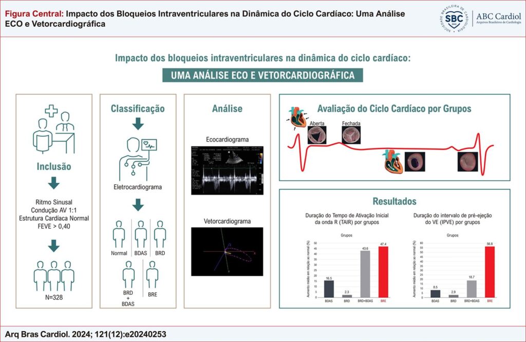 A idade dos participantes foi de 64,8±15,3 anos, com 57,9% do sexo masculino e fração de ejeção de 67,0±6,8%. O eletrocardiograma foi normal em 32,3%, 18,6% apresentavam bloqueio do ramo direito (BRD), 17,7% apresentavam bloqueio da divisão anterossuperior (BDAS), 15,6% apresentavam BRD+BDAS e 15,9% apresentavam BRE. No ecocardiograma, verificou-se aumento da pré-ejeção do ventrículo esquerdo de 18,7% (p<0,001) e 56,8% (p<0,001) no BRD+BDAS e BRE, respectivamente. Houve contração miocárdica pós-sistólica em todos os tipos de BIV e dissincronia ventricular no BRE. Pelo Vetorcardiograma, observou-se ativação inicial da onda R aumentada em 17,4% no BDAS (p<0,001), 43,5% no BRD+BDAS (p<0,001) e 47,4% no BRE (p<0,001) e final atrasada em 69,4% no BRE (p<0,001), 73,6% no BRD+BDAS (p<0,001) e 95,3% no BRD (p<0,001).