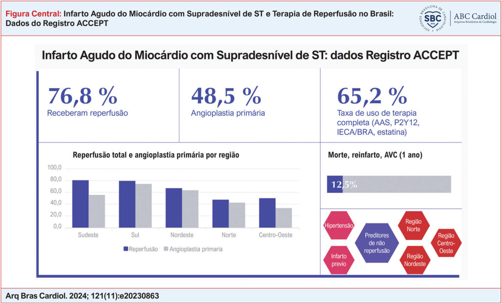 Na análise de 1.553 pacientes, a taxa de reperfusão foi de 76,8%, variando de 47,5% na região Norte a até 80,5% na região Sudeste. A taxa de eventos cardiovasculares maiores foi de 12,5% em 1 ano. A prescrição de terapias baseadas em evidência na admissão hospitalar foi de 65,6%. A presença de hipertensão (odds ratio [OR] 1,47; intervalo de confiança [IC] 95% 1,11 a 1,96; p < 0,01), infarto agudo do miocárdio prévio (OR 1,81; IC 95% 1,32 a 2,48; p < 0,001) e as regiões Norte (OR 4,65; IC 95% 2,87 a 7,52; p < 0,001), Centro-Oeste (OR 4,02 IC 95% 1,26 a 12,7; p < 0,05) e Nordeste (OR 1,70; IC 95% 1,17 a 2,46; p < 0,01) foram preditores independentes de não utilização de terapia de reperfusão.