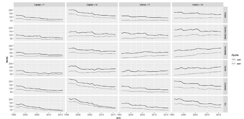 Estudo de séries temporais de 21 anos (1996 a 2016). Os dados são do Sistema de Informações sobre Mortalidade (SIM) e das estimativas populacionais do Instituto Brasileiro de Geografia e Estatística (IBGE). Foram feitas correções de óbitos por causas mal definidas, códigos-lixo e sub-registro. As séries temporais desagregadas por grandes regiões, sexo, capitais e interior foram analisadas utilizando a técnica de regressão linear segmentada por Jointpoint. O nível de significância estatística adotado foi de 5%.