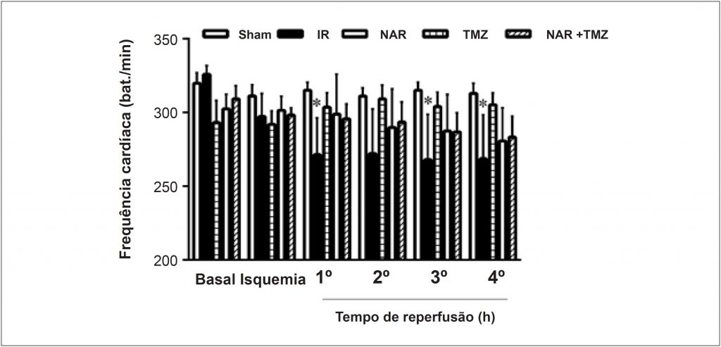 As ondas elétricas do NTS não se alteraram durante o tempo de isquemia, mas diminuíram significativamente durante todos os tempos de reperfusão. A atividade elétrica do NTS e a SBR foram reduzidas drasticamente em ratos com lesão I/R; no entanto, a administração de NAR e TMZ, isoladamente e combinadas, melhorou significativamente essas alterações em ratos com lesão I/R.