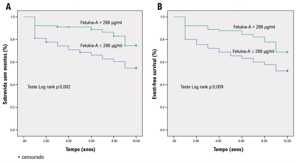 Durante um acompanhamento médio de 10 anos, foram registradas 71 mortes, das quais 62 foram devidas a DCV. Identificou-se um índice de mortalidade global e por DCV significativamente mais alto no grupo com nível de fetuína-A mais baixo que no grupo com nível de fetuína-A mais alto (44% versus 24%, p= 0,005; 48% versus 31%, p= 0,022, respectivamente). Nas análises de risco proporcionais por regressão de Cox, detectou-se que a fetuína-A era um preditor independente de mortalidade global e por DCV.