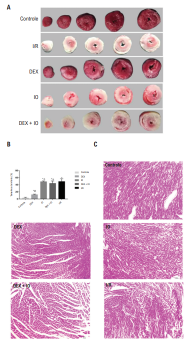 Corações de ratos foram perfundidos com o sistema de perfusão de Langendorff e aleatoriamente distribuídos em cinco grupos: grupo controle, perfundido com solução de Krebs-Henseleit (K-H) por 205 minutos sem isquemia; e quatro grupos de teste que foram submetidos a 40 minutos de isquemia global e 120 minutos de reperfusão. O Grupo DEX, o grupo ioimbina (IO) e o grupo DEX + IO foram perfundidos com DEX (10 nM), IO (1 μM) ou a combinação de DEX e IO antes da reperfusão, respectivamente. A hemodinâmica cardíaca, o tamanho do infarto do miocárdio e a histologia do miocárdio foram avaliados. A expressão da proteína-78 regulada pela glicose (GRP78), a proteína quinase do retículo endoplasmático (PERK), a PERK fosforilada, o fator de iniciação eucariótico 2α (eIF2α), eIF2α fosforilado, o fator de transcrição 4 (TCF-4) e a proteína homóloga à proteína ligadora do acentuador CCAAT (CHOP) foram avaliados. P< 0,05 foi considerado para indicar a diferença estatisticamente significativa.