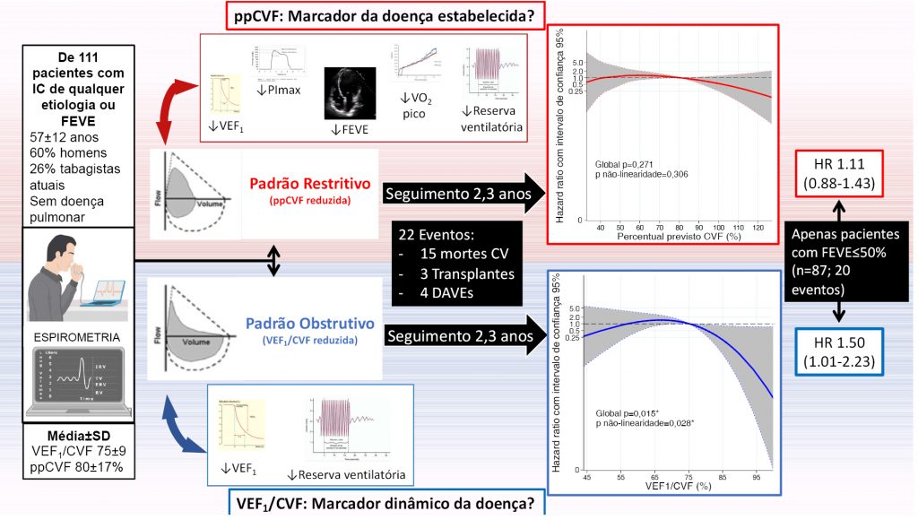 Na IC crônica, ppCVF reduzido associou-se a menor PImáx, FEVE, VRes e VO2 pico, mas não distinguiu pior prognóstico em 2,2 anos de acompanhamento. Entretanto, VEF1/CVF associou-se apenas com VRes, e, em participantes com FEVE ≤50%, o VEF1/CVF reduzido mostrou pior prognóstico proporcional. Portanto, VEF1/CVF e ppFVC contribuem para melhor fenotipagem de pacientes com IC.