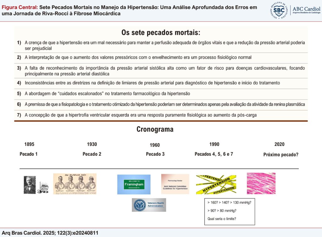 A medicina é talvez a única ciência que valoriza mais o conhecimento das publicações científicas mais recentes do que sua história ao longo do tempo. A epistemologia médica mostra que alguns erros e acertos estão tão próximos que muitas vezes não os diferenciamos prontamente. A produção do conhecimento médico nos faz entender que o conhecimento é transitório e as teorias precisam ser revalidadas, retificadas ou lapidadas, quando não destruídas e reconstruídas sobre outras bases; paradigmas que se renovam movimentam a ciência. Com essa visão crítica, tornou-se necessário acessar quanto conhecimento sobre hipertensão arterial foi construído ao longo dos últimos 130 anos, desde que a aferição da pressão arterial começou a ser difundida e se tornou rotina na prática médica até os dias atuais. A presente revisão crítica focou em erros na interpretação do conhecimento adquirido, sete dos quais foram identificados, profundamente discutidos e condenados como pecados devido à demora em serem reconhecidos, permitindo assim que a vida das pessoas com esta patologia cardiovascular fosse encurtada.