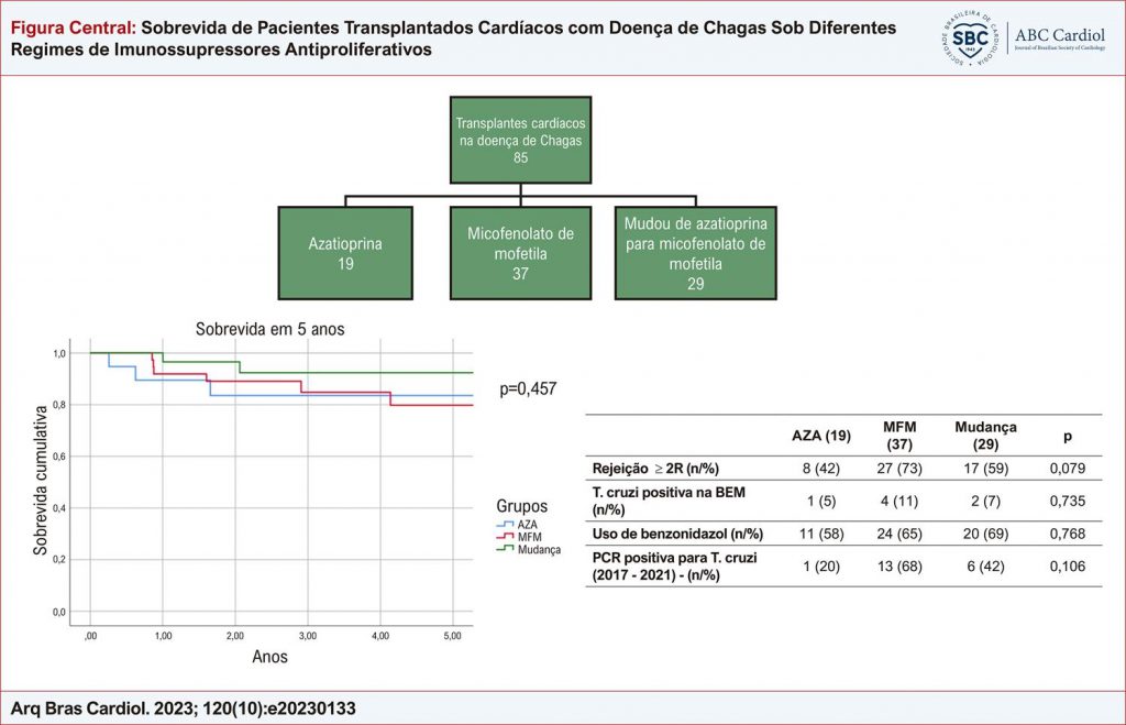 Foram incluídos 85 pacientes, 54,1% homens, idade mediana 49 (39-57) anos, e 91,8% com prioridade na lista de espera. Dezenove (22,4%) usavam azatioprina, 37 (43,5%) micofenolato de mofetila, e 29 (34,1%) trocaram a terapia; a sobrevida não foi diferente entre os grupos, 2,9 (1,6-5,0) x 2,9 (1,8-4,8) x 4,2 (2,0-5,0) anos, respectivamente; p=0,4. Não houve diferença na taxa de rejeição (42%, 73% e 59% respectivamente; p=0,08) ou de RDC (T. cruzi positiva na biópsia endomiocárdica 5% x 11% x 7%; p=0,7; uso benzonidazol 58% x 65% x 69%; p=0,8; PCR positiva para T. cruzi 20% x 68% x 42% respectivamente; p=0,1).