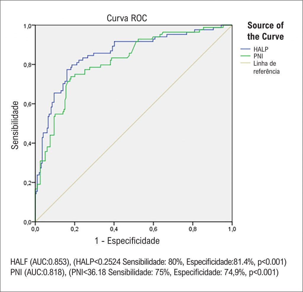 O escore HALP foi de 0,173 (0,125-0,175) em pacientes com câncer. Detectou-se que em pacientes não oncológicos o escore foi de 0,32 (0,20-0,49; p<0,001). O escore de PNI foi de 33,1±5,6 em pacientes com câncer. Detectou-se que em pacientes não oncológicos o escore foi 39,8±4,8 (p<0,001).