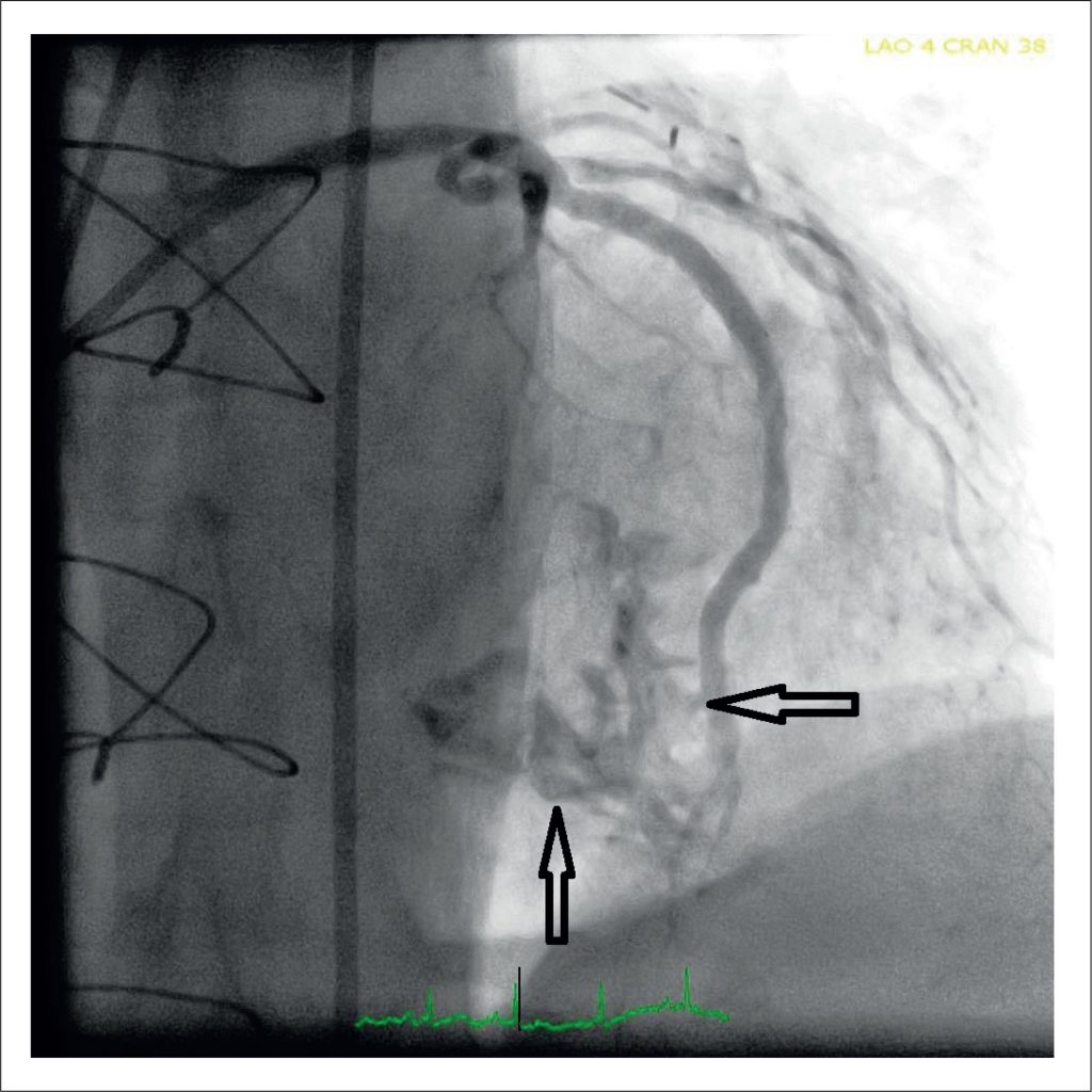 As fístulas coronário-camerais, embora consideradas em sua maioria como entidades congênitas, também têm sido encontradas como complicações de grandes traumas e intervenções coronárias percutâneas (ICPs). Por outro lado, o hematoma do septo interventricular (SIV) pode potencialmente surgir principalmente durante intervenções de oclusão total crônica retrógrada (OTC) e tem um curso benigno nesse contexto. Aqui, descrevemos uma complicação desafiadora da ICP (e sua estratégia de manejo) apresentando hematoma do SIV, fístula ventricular direita e obstrução da via de saída do ventrículo direito (VSVD) devido a um stent coronário mal implantado na artéria septal perfurante (ASP).
