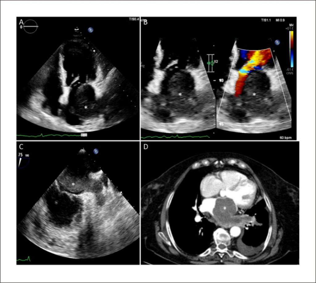 Uma mulher de 71 anos apresentou fadiga, dispneia e anorexia. O exame físico revelou um sopro diastólico grave grau III no foco mitral. O ecocardiograma transtorácico (ETT) mostrou uma massa oval no interior do átrio esquerdo (AE) estendendo-se de seu teto até a válvula mitral ( ), causando importante gradiente de pressão transmitral ( ). O ecocardiograma transesofágico (ETE) ( ) levantou a suspeita de comprometimento da veia pulmonar superior esquerda, o que foi confirmado pela angiografia por tomografia computadorizada (TC) ( ). A ressonância magnética cardíaca caracterizou a massa como isointensa em imagens ponderadas em T1 e hiperintensa em T2; havia captação do contraste nas sequências de primeira passagem e realce tardio pelo gadolínio heterogêneo ( ).