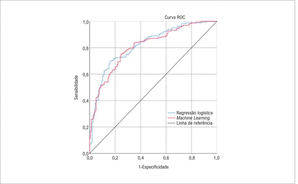 A amostra de treinamento tinha idade média de 59 ± 15 anos, 58% do sexo masculino, e uma prevalência de doença coronariana de 52%. O modelo logístico foi composto de nove preditores independentes. O algoritmo machine learning foi composto por todos os candidatos a preditores. Na amostra teste, a área sob a curva ROC para predição de doença coronariana foi de 0,81 (IC95% = 0,77 – 0,86) para o algoritmo machine learning, similar à obtida no modelo logístico (0,82; IC95% = 0,77 – 0,87), p = 0,68.