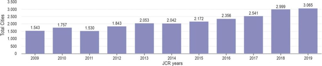 Our most recent journal impact factor (2019) is 1.450 and the 5-year impact factor of 1.724, the highest in our history. Additionally, the number of citations in a given year also reached its all-time highest number of 3065 citations in just one year ( ). There has been an upward trend of our journal impact factor, from the previous 1.318 (2017) and highest impact at 1.679 (2018) , ( ). International collaboration has been increasing significantly. Currently, about 11% of our published articles are from authors of more than one country (multinational, ), and 22% of articles are originating from countries other than Brazil ( ). Our editorial board has now international associated editors that are the angular stone for increasing international collaboration and publications in the ABC Cardiol. Moreover, collaboration with the international scientific community and societies has been boosted.
