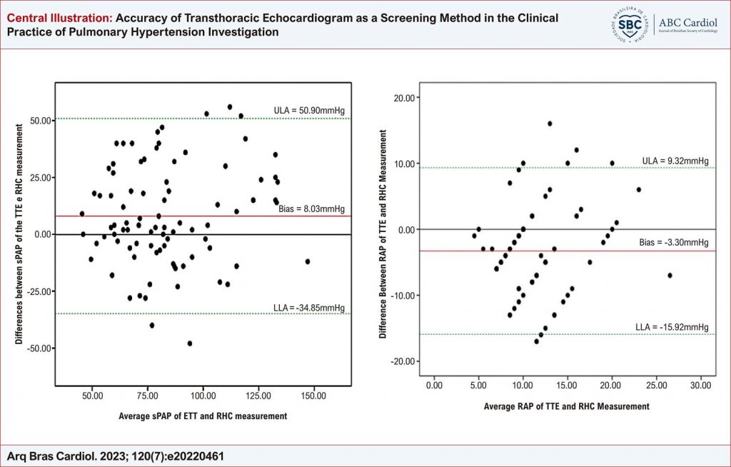 TTE has a high discriminatory power as a screening diagnostic method for PH despite presenting disagreements between sPAP and RAP absolute values when compared to RHC measurements.