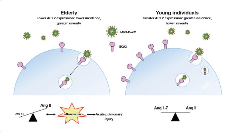 Abnormalities induced by aging in metabolic pathways may partly explain the higher rate of COVID-19 morbidity and mortality in elderly patients. These include those belonging to the renin-angiotensin system (RAS), given the crucial role that this system plays both in viral transmissibility and in the pathogenesis of acute lung injury and its most severe form: acute respiratory distress syndrome (ARDS).