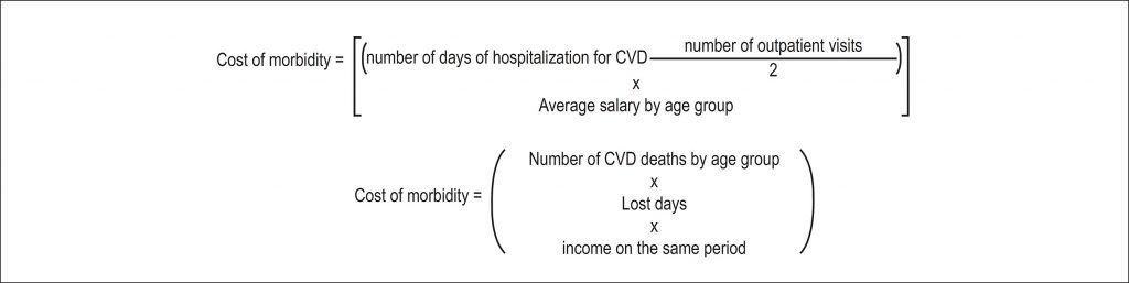 The information to estimate CVD costs was taken from national databases, adding the direct costs with hospitalizations, outpatient visits and benefits granted by social security. Indirect costs were added to the calculation, such as loss of income caused by CVD morbidity or mortality.