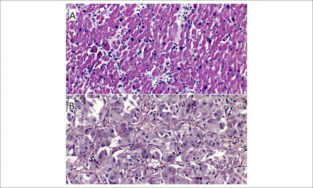 A 64-year-old woman with a history of Diabetes and Hypertension was admitted to the emergency department with acute dyspnea and chest pain. Physical examination revealed hypertension, sinus tachycardia (150 bpm), acute pulmonary edema and poor extremity perfusion. In the context of respiratory failure and hemodynamic instability, she required invasive mechanical ventilation. Blood works showed increased levels of hs-TroponinT (rising from 800 to 1600 ng/L) and the ECG showed poor R wave progression and incomplete right bundle branch block. The echocardiogram revealed a hypertrophied left ventricle, with severe systolic dysfunction and akinetic apical and middle segments. Considering the possibility of acute coronary syndrome, the patient was referred for emergent coronary angiography, which revealed normal coronary arteries. She was admitted to the intensive care unit with the presumed diagnosis of Takotsubo cardiomyopathy. Through the rest of the day, she presented with fluctuating blood pressure and required elevated levels of positive end-expiratory pressure due to pulmonary edema. Despite an apparent favorable evolution, she suddenly developed asystole, refractory to resuscitation efforts, dying less than 24 hours after admission.