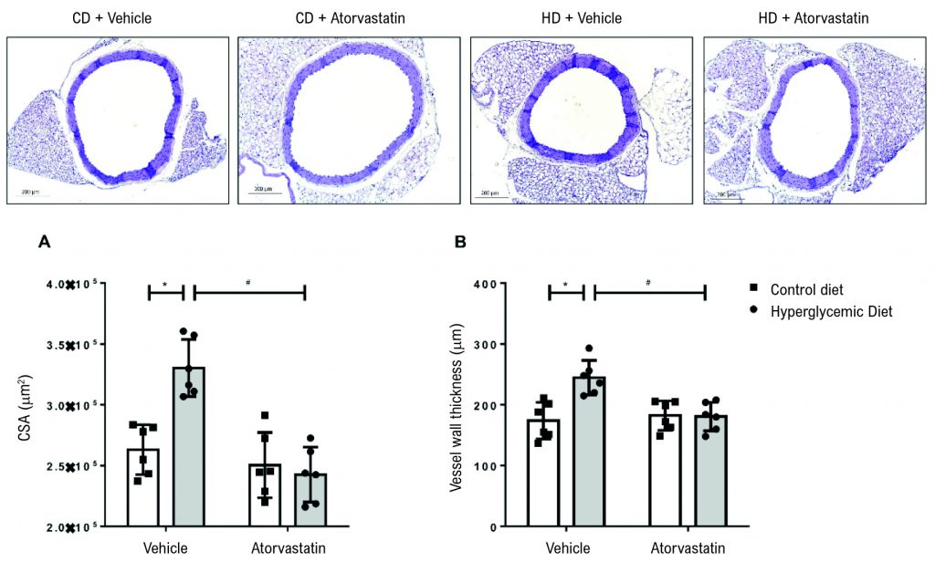 Swiss mice received a control diet or a hyperglicemic diet for 18 weeks. After 14 weeks of diet, mice were treated with vehicle or atorvastatin (20mg/kg) during for 4 weeks. Nutritional and metabolic profiles were assessed by biochemical tests; moreover, a histological assessment of aorta structure was conducted, and cytokine levels were determined by the immunoenzyme assay. The acceptable level of significance for the results was set at p<0.05.
