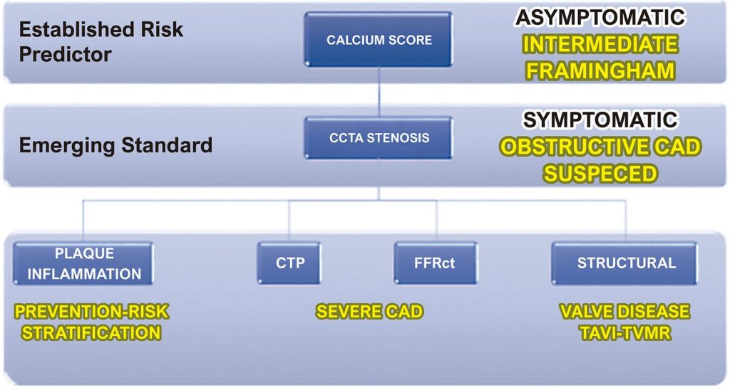 As an example, we can mention the high accuracy of CCT in the diagnosis and quantification of coronary atherosclerosis and stenosis ( ), and assessment of functional significance by the fractional flow reserve (FFR) technique. Considering recent knowledge of the role of characteristics of the plaque and the global burden of the atherosclerotic plaque involving the coronary tree on the prognosis of coronary artery disease (CAD), CCT has turned out to be a key tool in therapeutic decision making, be it for stenosis revascularization, be it for prevention of adverse cardiovascular events. Another example is the ability of CCT in monitoring the response of atherosclerotic plaques to advanced therapies, like those including PCSK9 inhibition by monoclonal antibodies or RNA interference. – , –