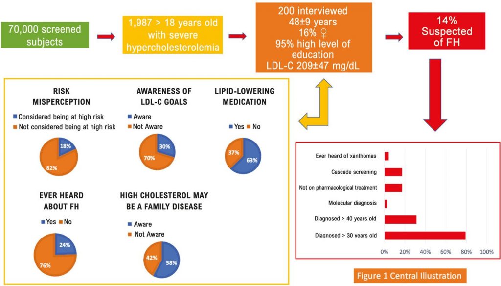 Although 97% of the sample (age 48±9 years; 16% women; 95% college/university education; 88% primary prevention; LDL-C 209±47 mg/dL) had severe hypercholesterolemia, only 18% and 29.5% believed to be at high ASCVD risk and reported knowledge of their recommended LDL-C goal, respectively. Fifty-eight percent reported being informed that high cholesterol could be a family disease, 24.5% (n = 49) had ever heard about FH, and merely 14% (n = 29) had been previously identified as suspected of having FH (age at FH diagnosis 35±12 years; 79% and 31% diagnosed, respectively, > 30 and > 40 years old). Only 2.5% underwent genetic tests, 17% underwent cascade screening, and 17% were not in use of pharmacological treatment.