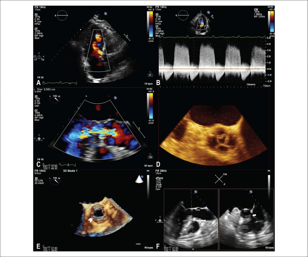 The transthoracic echocardiogram (TTE) showed aortic regurgitation (), with non-dilated cardiac chambers and preserved biventricular function. The acoustic window limited the evaluation of the valvular lesion severity and its importance in the context of the complaints, although the continuous Doppler spectrum suggested significant regurgitation (). The evaluation was further impaired by a systolic flow acceleration in the Left Ventricular Outflow Tract (LVOT), with no significant gradient and an undetermined cause. The aortic root had normal size, but it was not possible to carry out an adequate morphological and functional characterization of the valve.