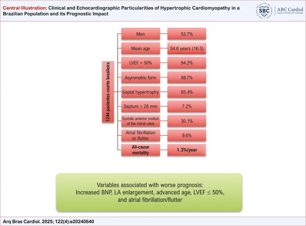 The study included 1244 patients, between 2010 and 2022, with a mean follow-up time of 7.7 ± 4.5 years; 53.6% of patients were men. Mean age was 54.6 ± 16.5 years, and mean left ventricular ejection fraction (LVEF) was 65.8% ± 7.6. We observed LVEF ≤ 50% in 5.8% of patients, asymmetric form in 88.7%, and septal hypertrophy in 85.4%. We found systolic anterior motion of the mitral valve in 30.1% of patients, left ventricular outflow tract obstruction in 30.7%, and septum ≥ 28 mm in 7.2%. Only 1 patient had ventricular aneurysm. Atrial fibrillation/flutter occurred in 9.6% of patients. Overall mortality occurred in 232 patients (1.3%/year). Patients with B-type natriuretic peptide (BNP) > 200 pg/ml, left atrium ≥ 45 mm, and LVEF ≤ 50% had higher mortality (p < 0.001). Age and atrial fibrillation/flutter were also associated with mortality.