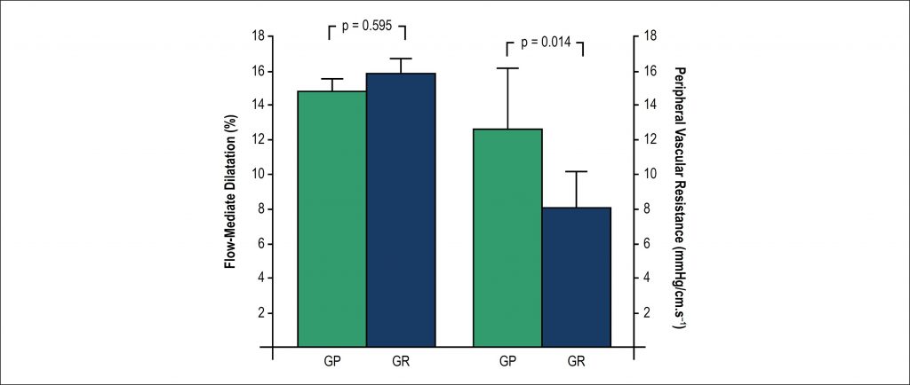 PG showed higher SBP/DBP (p < 0.001); greater interventricular septum thickness (p < 0.001), posterior wall thickness (p < 0.001) and LV mass (p < 0.001). After adjusting LV mass by body surface area (BSA), no difference was observed. As for diastolic function, LV diastolic volume, wave E, wave e’, and E/e’ ratio were similar for both groups. However, LA volume (p = 0.016) and BSA-adjusted LA volume were lower in PG (p < 0.001). Systolic function (end-systolic volume and ejection fraction), and FMD were similar in both groups. However, higher PVR in PG was observed (p = 0.014). We found a correlation between the main cardiovascular changes and total weight lifted in PG.